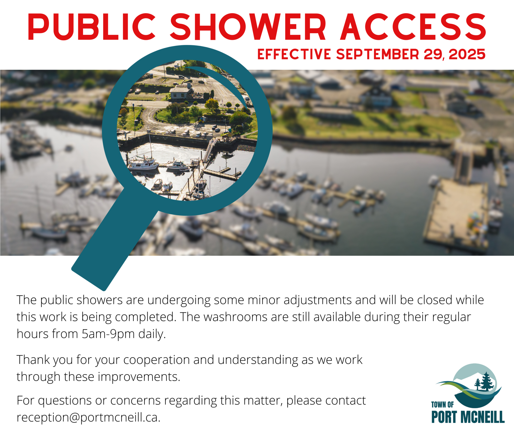 The public showers are undergoing some minor adjustments and will be closed while this work is being completed. The washrooms are still available during their regular hours from 5am-9pm daily.